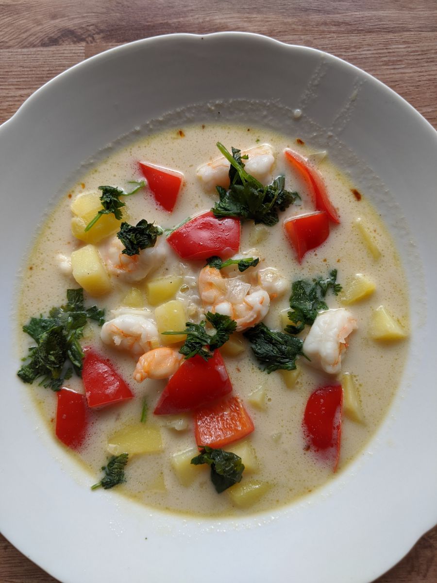 Z u b e r e i t u n gIngwer schälen und fein würfeln.Schalotten fein würfeln. Knoblauchzehe fein würfeln. Chilischote längs einschneiden, entkernen und fein schneiden. Kartoffeln schälen und 1 cm groß würfeln. Paprikaschote vierteln, entkernen und in 1/2 cm große Würfel schneiden. 1 EL Olivenöl in einem Topf erhitzen. Ingwer, Schalotten, Knoblauch und Chili darin bei mittlerer Hitze 3 Minuten dünsten. Kartoffeln zugeben und 2 Minuten mitdünsten, dabei mit Salz und 1 Prise Zucker würzen. Kokosmilch und Wasser zugießen, aufkochen und zugedeckt 15 Minuten kochen. Garnelen (geschält, küchenfertig) und Paprika zugeben, aufkochen und weitere 5 Minuten garen. Eintopf evtl. nachsalzen und mit den Blättern des Koriandergrüns bestreut servieren. (aus: Für jeden Tag/11/2013) ![]() Hauptgruppe: Suppe Untergruppe: Quelle: Für jeden Tag Kriterien: |
