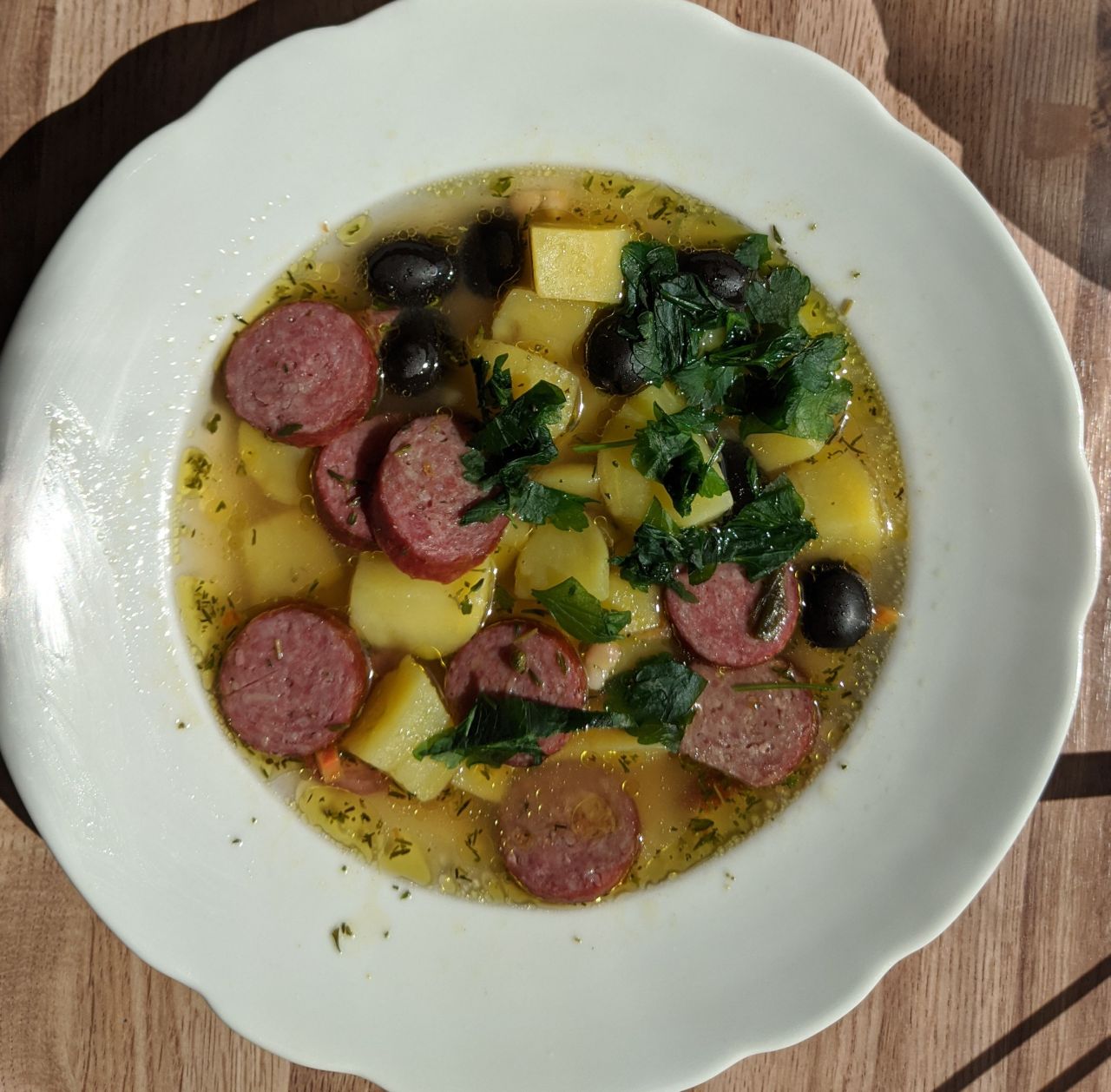 Z u b e r e i t u n gOliven 10 Minuten in kaltes Wasser legen.In einem Topf Rinderbrühe erwärmen (Instant oder Fond) Bohnen, Kartoffeln in Stücken, Cabanossi (Knoblauchwurst) in Scheiben, Oliven und Thymian hinzugeben. Mit Cayennepfeffer würzen. 10 Minuten ziehen lassen. Petersilie und Olivenöl zugeben. Servieren. Dieses Rezept ist abgeleitet (vereinfacht) eines Rezepts in Essen & Trinken. Da werden Riesenbohnenkerne am Tag vorher eingeweicht und am folgenden Tag 2 Stunden gekocht, dann rohe Kartoffeln hinzugefügt und gekocht. ![]() Hauptgruppe: Hauptgericht Untergruppe: Kartoffel Quelle: Kriterien: |