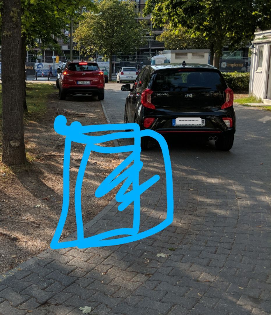 Hochheim - Verwarnungauf der blau markierten Fläche darf man nicht mehr parken. Das rote Auto weiter hinten parkt "in einer Grünanlage" (wie bisher)